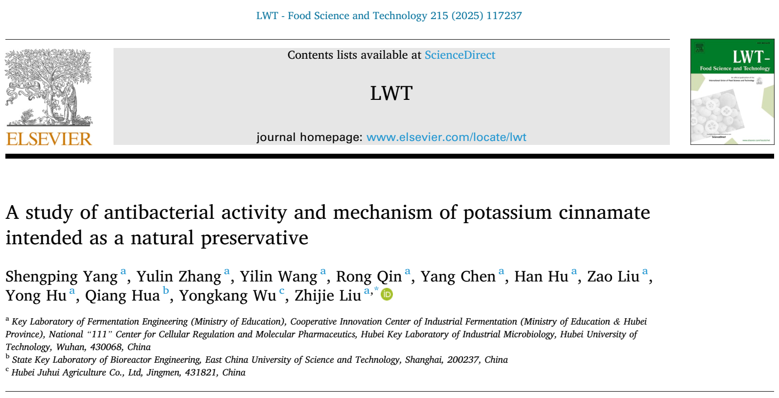 近日,五星体育在线直播节目表生命科学与健康工程学院柳志杰教授团队在《LWT-Food Science and Technology》在线发表了题为“A study of antibacterial activity and mechanism of potassium cinnamate intended as a natural preservative”(肉桂酸钾作为天然防腐剂的抗菌活性及机理研究)的研究论文(原文链接:https://doi.org/10.1016/j.lwt.2024.117237)。研究生杨胜平为第一作者,华东理工jrs直播NBA和湖北聚汇农业开发有限公司为论文合作单位。