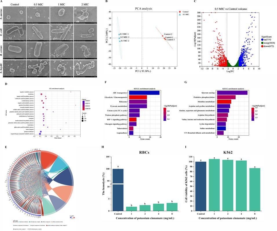 食源性致病菌是引发食品污染的重要原因,但现有抗菌剂在应对其:Ψ矫嫒悦媪偌际鹾陀τ蒙系钠烤。该研究对肉桂酸钾的抗菌活性进行了深入探讨,揭示其通过抑制细菌生物膜形成、增加细胞内活性氧水平、破坏细胞膜完整性等多种机制显著干扰细菌代谢,最终导致细胞内容物渗漏和死亡。RNA-Seq分析进一步表明,蜡样芽孢杆菌经肉桂酸钾处理后,其膜和质膜相关基因在GO功能分类中显著富集;而KEGG注释分析表明,与群体感应、能量代谢及氨基酸合成相关的基因显著下调。此外,溶血和细胞毒性实验表明,肉桂酸钾在有效浓度下表现出良好的生物安全性。